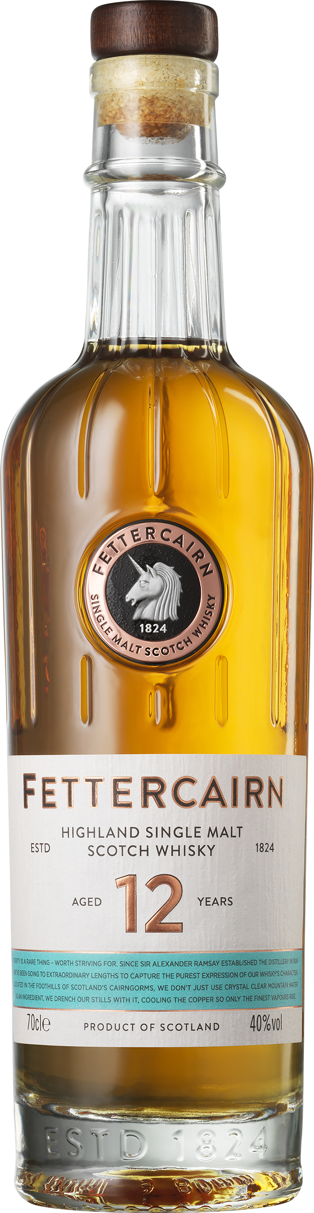 Fettercairn ist Ausdruck von technischer Raffinesse und wahrer Leidenschaft für die Brennkunst. Die Basis dieses Single Malt ist das kristallklare Wasser, das einer der höchsten Bergketten Schottlands entspringt – den Cairngorm Mountains. Einzigartige Kühlringe aus Kupfer sorgen außerdem dafür, dass auch außen an der Destillationsblase Wasser hinabläuft und diese kühlt. Die Kondensation wird so verstärkt und nur die feinsten Dämpfe steigen aufEin ganz besonderer 12-jähriger Single Malt und der perfekte Einstieg in die Welt der einzigartigen tropischen, frischen und fruchtigen Aromen von Fettercairn. Umspielt die Nase mit feinen Vanille-und Birnennoten-Nektarinen, tropische Früchte bereiten den Weg für feinen Röstkaffee, Nelke und Ingwer.