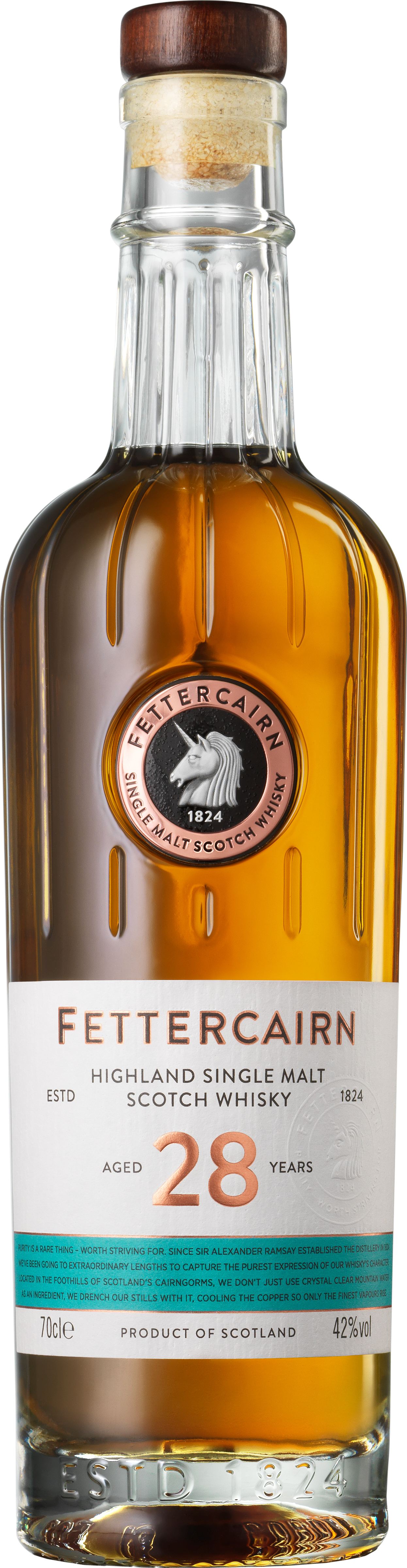 Ein tief Golden schimmernder Single Malt. 28 Jahre Lagerung in ehemaligen Bourbon Fässern und der einzigartige Fettercairn "Cooling Ring" verleihen ihm die typischen tropischen Aromen in der Nase und intensive würzige Noten von Zitrusschale, Pfeffer und Kaffee am Gaumen.