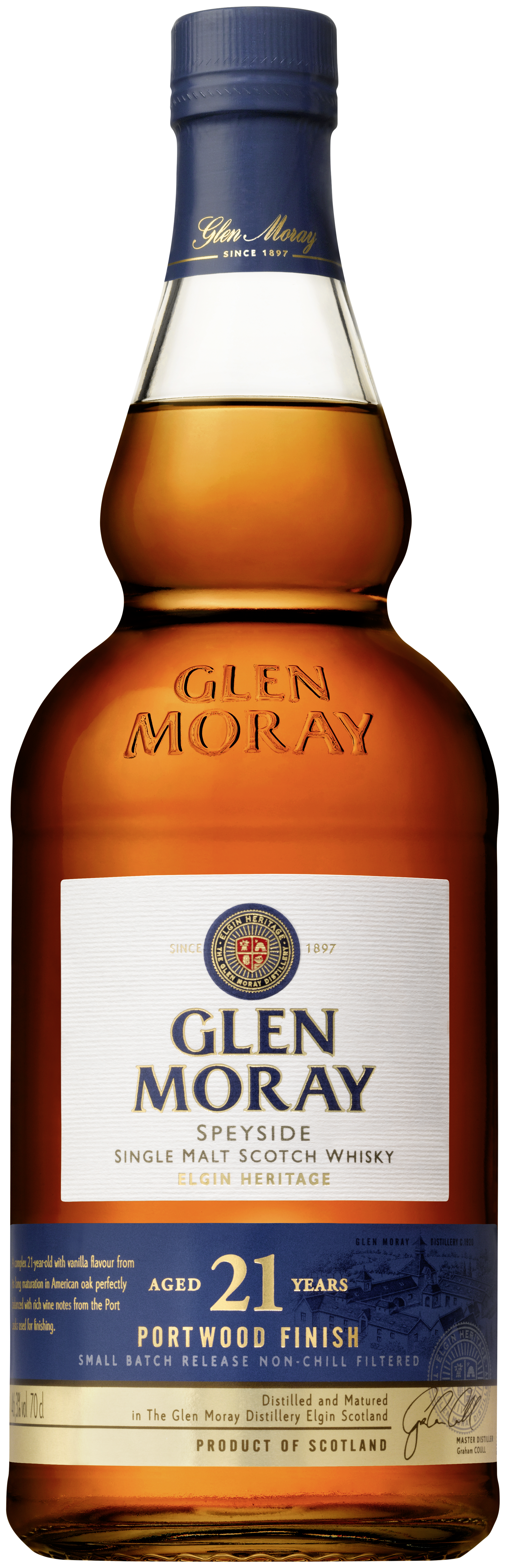 Im Herzen der Speyside destilliert Glen Moray seit mehr als 125 Jahren feinsten Single Malt. Der 21 Years Portwood Finish der Glen Moray Heritage Collection besticht durch seine vielschichtigen Aromen und seinen einzigartigen Charakter. Nach der Reifung in first fill Bourbon Fässern lagert er weitere zwei Jahre in Tawny Port Fässern von Porto Cruz, der Nr.1 Portweinmarke weltweit. In der Nase zeichnet er sich durch fruchtige Beerenaromen und süßen Noten von Karamell und Vanille aus. Im Geschmack ausbalanciert mit Johannisbeeren und Lakritze gefolgt von Noten von Karamellbonbons und Chili-Schokolade.