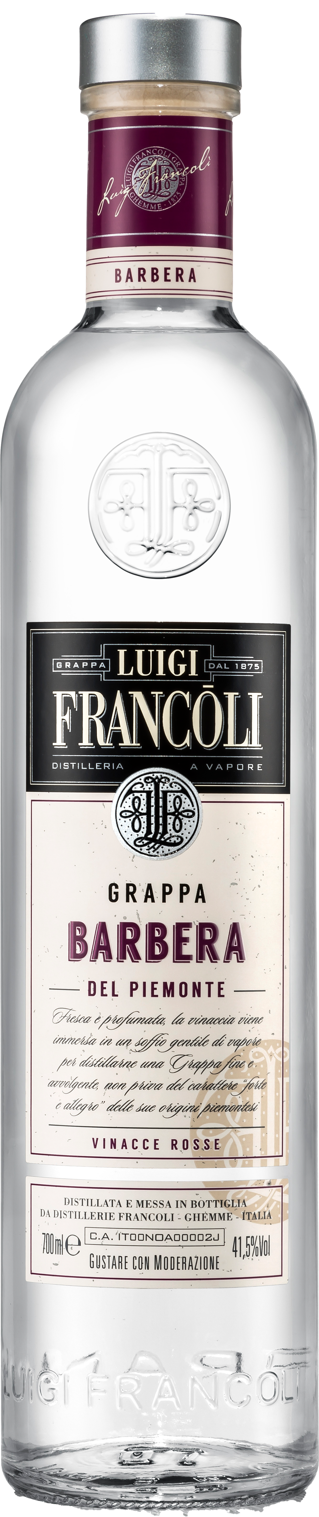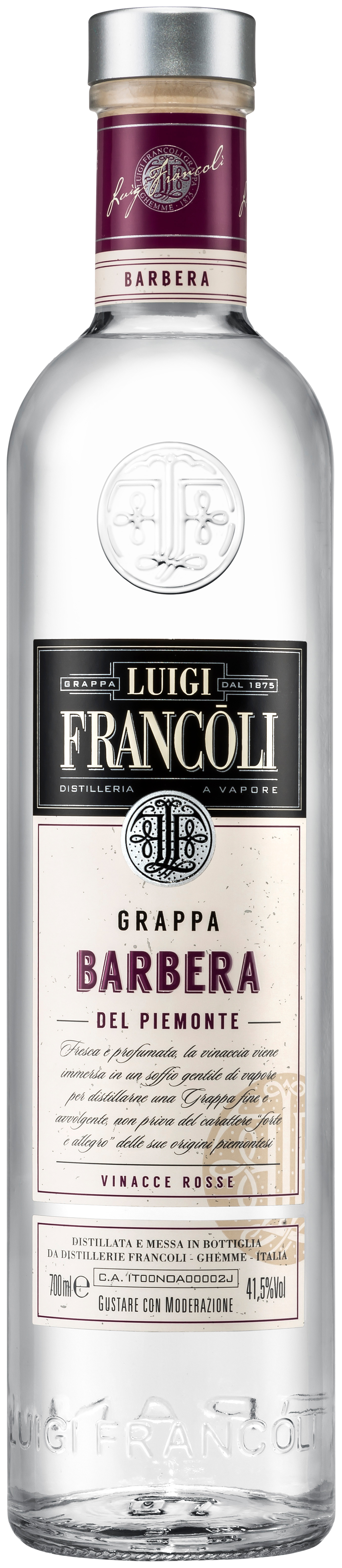 Prodotto e messa in bottiglia da Distillerie Francoli Via Romagna No 20 Ghemme (NO) Italia